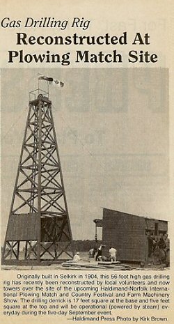 By mid-June, construction of the 62 ft. high derrick that was to tower over the natural gas display at the 2006 International Plowing Match (IPM) was nearly complete. It took 3000 feet of red pine-2x6’s and 2x8’s-to build the tower. (Haldimand Press August, 1997)
